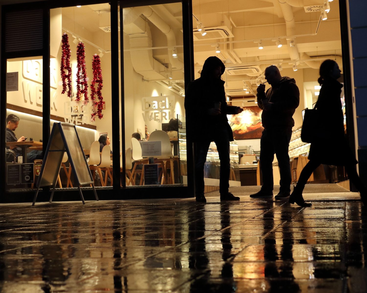 Die Wiener sind unterwegs um ihre Weihnachtseinkäufe zu machen. Vom Regen lassen sie sich nicht abhalten. Die nassen Pflastersteine der Mariahilfer Straße geben ein recht gutes Fotomotiv ab, stelle ich fest.